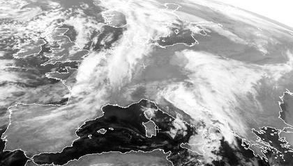 Das Wolkenband, das sich von Skandinavien bis Südfrankreich erstreckt, bildet die Kaltfront eines Tiefs über Island die heute im Norden Deutschlands Regen bringt. Hinter der Front bilden sich in kühleren Luftmassen örtliche Schauer, die rund um die Britischen Inseln gut zu erkennen sind. Ein kleines Tief über den Alpen sorgt von Italien bis auf den Balkan ebenfalls für zum Teil kräftigen Regen oder Schauer. Zwischen Südfrankreich und der Ostsee sorgt ein kleines Zwischenhoch für meist freundliches Wetter.
