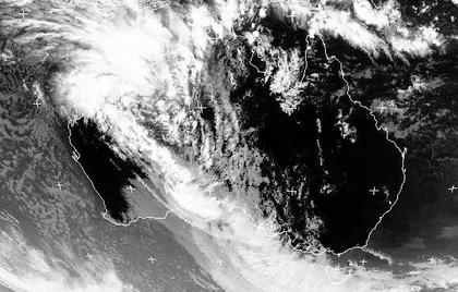 Auf dem Satellitenbild von Samstag früh heben sich die hohen und kalten Wolken (im Infrarot weiß dargestellt) im Nordwesten gut von dem warmen (im Infrarot schwarz dargestellt) Boden des Kontinents ab. Diese Wolken sorgen heute für teils kräftige Schauer und Gewitter. Auch an der Großen Australischen Bucht kann es kräftig regnen.