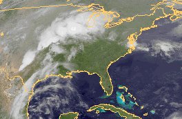 Über dem Zentrum der USA hat sich entlang einer Grenze zwischen warmer Luft im Südosten und kühlerer Luft im Nordwesten ein Tief mit kräftiger Bewölkungsentwicklung gebildet. Es kommt hier zu Gewittern und teils sehr kräftigem Regen.