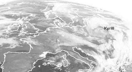 Der Orkan 'Kyrill' zieht weiter nach Russland. Er hat sich dabei schon etwas abgeschwächt. In Deutschland führt eine immer noch recht starke Nordwestströmung feuchte und etwas kühlere Luft von der Nordsee heran. Dabei kommt es auch noch zu etwas Regen. Teils lockert es aber auch schon auf. Die dichtesten Wolken findet man über Süddeutschland. (Bildquelle: NERC Satellite Receiving Station, Dundee University, Scotland, http://www.sat.dundee.ac.uk/)