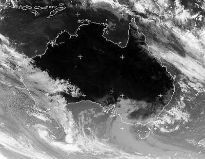 Ein Hoch sorgt für geringe Bewölkung über weiten Teilen des australischen Kontinents bis in den Norden. Im Westen zieht ein Tiefausläufer mit seinen Wolken ins Land. Vor der Südostküste erkennt man zudem einen kleinen Bereich mit Schauerwolken. Sie sind in einem Kaltlufttropfen entstanden.(Bildquelle: NERC Satellite Receiving Station, Dundee University, Scotland, http://www.sat.dundee.ac.uk/)