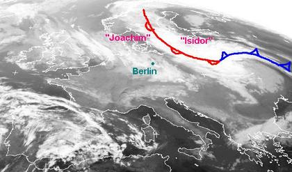 Das Tief 'Joachim' löst sich heute über Dänemark auf, seine Regenwolken sind über Deutschland und der Nordsee zu erkennen. Über Osteuropa liegt das Höhentief 'Isidor', auf dem Satellitenbild erstreckt sich die Warmfront des Tiefs von seinem Zentrum bis nach Skandinavien, die Kaltfront reicht bis nach Südwestrussland. Ein weiteres Tief bringt Abkühlung in Spanien und Portugal. Von Frankreich über Italien bis zum Balkan ist es unter Hochdruckeinfluss meist wolkenarm.