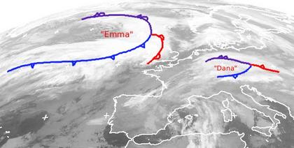 Während über der Mitte und im Süden Deutschlands das Tief 'Dana' noch viele Wolken und Regen bringt, formiert sich auf dem Atlantik das Orkantief 'Emma'. Seine Wolken haben dabei die Britischen Inseln erreicht. Es zieht nun mit rascher Geschwindigkeit nach Mitteleuropa weiter und erreicht Deutschland in den Abendstunden. Neben starken Wind haben die Wolken dabei viel Regen im Gepäck. (Bildquelle: NERC Satellite Receiving Station, Dundee University, Scotland, http://www.sat.dundee.ac.uk/)