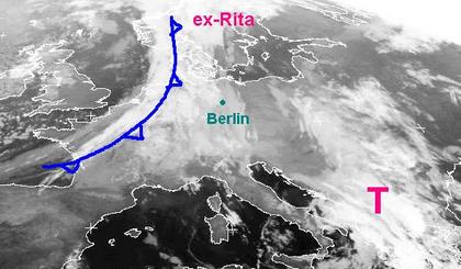 Ein Wolkenband mit teils ergiebigem Regen erstreckt sich auf dem Satellitenbild vom Samstagmorgen von Skandinavien über Deutschland bis nach Frankreich; er gehört dem Frontensystem von Tief 'ex-Rita' über der Nordsee. Ein weiteres Tief bringt kräftige Niederschläge auf dem Balkan, zu Beginn der neuen Woche löst sich das Tief jedoch auf.