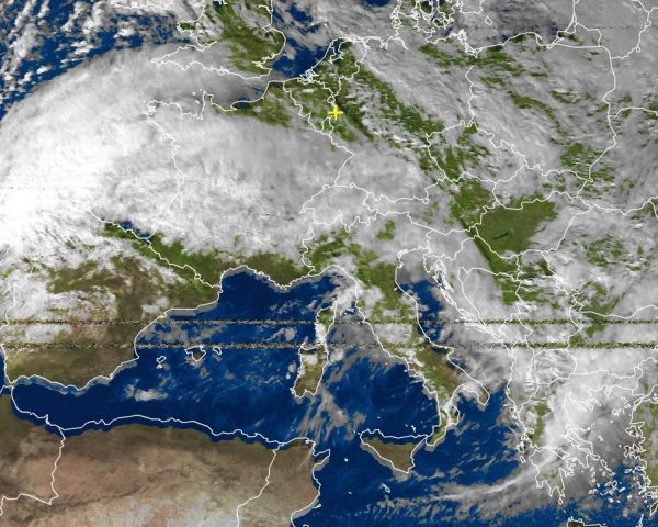 Auf dem Satellitenfoto von heute Nachmittag sind über dem Mittelmeerraum, von wenigen Ausnahmen abgesehen, kaum Regionen mit dichter Bewölkung vorhanden, verbreitet herrscht warmes und sonniges Wetter. Dagegen erstreckt sich ein sehr breites und dichtes Wolkenband von der Biskaya, über Frankreich, die Alpenländer und weiter zum Balkan und über die Ägäis bis in die westliche Türkei. Hierbei bilden sich wiederholt Schauer und vor allem über der Ägäis und an der türkischen Westküste auch zahlreiche, regional sehr kräftige Gewitter.