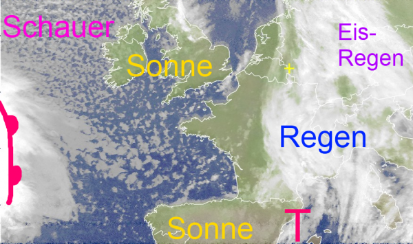 Morgen setzt sich von Westen zunächst eine kurze Wetterberuhigungphase durch, bevor im Tagesverlauf vom Atlantik die Regenwolken eines neuen Frontensystems nahen.