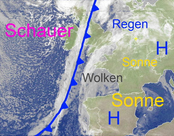 Die langgestreckte Kaltfront zieht mit ihrem Wolken- und Niederschlagsband nach Osten und überquert im Laufe der Nacht große Teile Deutschlands. Hinter ihr strömt ab wieder kältere Polarluft nach Mitteleuropa, wobei die nachfolgenden Schauer vor allem in den höheren Lagen wieder in Schnee übergehen können.