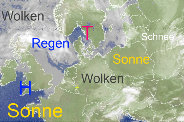 Sonst wechseln sich über unserem Kontinten Gebiete mit Sonne und Wolken ab.