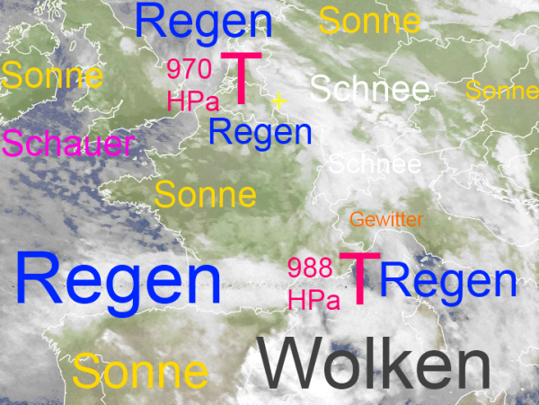 Der Wolkenwirbel über den Benelux Staaten mit einem Kerndruck von 970 HPa sorgt in weiten Teilen Mitteleuropas für ungemütliches Schmuddelwetter. Regional fällt Schnee bis in tiefere Lagen herab und sorgt für Glätte auf Straßen und Gehwegen. Sonst fällt bei zum Teil stürmischen Windböen reichlich Regen.