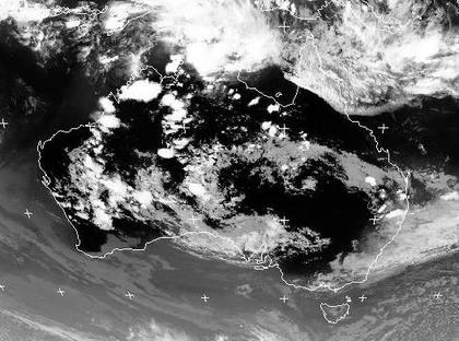 Auf dem Satellitenbild von Donnerstag früh sind Schauer- und Gewitterzellen im Norden und Westen von Australien gut zu erkennen. Die Hochreichenden, und damit kalten Wolkenoberkanten (im Infrarotbild weiß dargestellt) heben sich stark vom warmen Erdboden ab (im Infrarotbild schwarz dargestellt).