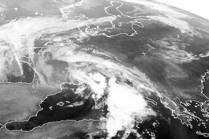 Auf dem Satellitenbild von Freitag früh sind vor allem im Mittelmeer zwischen Korsika und Italien dichte Wolken zu erkennen. Diese Wolken gehören zu einem Tief über Südfrankreich, dass heute langsam nach Nordosten zieht. In Italien sorgt dieses Tief für kräftige Schauer und Gewitter. Auch von der Adria über die Alpen bis zu den Benelux-Ländern erstrecken sich Wolken, die örtlich auch gewittrige Schauer bringen können. In Osteuropa sorgt ein Hochdruckgebiet noch für einen fast Wolkenfreien Himmel.