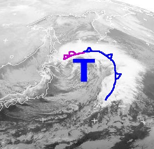 Der Ausschnitt zeigt ein Sturmtief über dem westlichen Pazifik. Von Kamtschatka bis nach Japan bringt es teils kräftige Schneefälle und Schneeschauer bei stürmischem Wind. Man erkennt sehr gut die Kaltfront des Tiefs, auf ihrer Rückseite haben sich in kalter Luft mehrere Schauerwolken entwickelt.