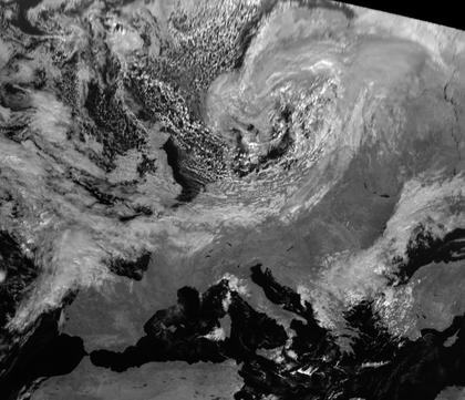 Auf dem Satellitenbild ist an der Bewölkung das Sturmtief 'Sören' mit Zentrum über der nördlichen Ostsee erkennbar. Vor der Küste Skandinaviens ist sehr schön die zelluläre Bewölkung einer instabil geschichteten Luftmasse zu sehen. In den Alpen und im südlichen Osteuropa sind deutlich die Seen erkennbar.