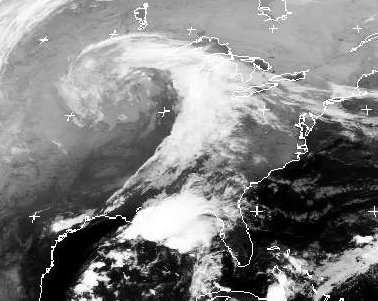Während weiter im Westen und Norden keine Wolken liegen, ist die Bewölkung eines Tiefs über dem Zentrum der USA gut zu erkennen. Die Warmfrontbewölkung erstreckt sich nach Neuengland, ist aber zerfallen und bringt auch keinen Regen. Die Kaltfront entlang des Mississippi ist umso deutlicher ausgeprägt. Auf ihrer Vorderseite haben sich am Golf von Mexiko zudem kräftige Gewitter gebildet. (Bildquelle: NERC Satellite Receiving Station, Dundee University, Scotland, http://www.sat.dundee.ac.uk/)