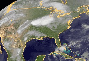 An den Großen Seen auf der Grenze zwischen Kanada und den USA liegt ein kräftiges Tiefdruckgebiet. Es zieht mit seinen Ausläufern langsam nach Osten. Besonders ausgeprägt und hochreichend ist die Bewölkung an seiner Kaltfront auf der Südseite, wo kühlere Luft mit der feucht-warmen Luft über dem Süden der USA zusammentrifft. Hier entstehen starke Gewitter mit heftigem Regen.