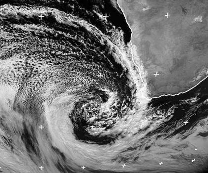 Ein ausgeprägter Tiefdruckwirbel liegt westlich des Kaplands von Südafrika. Seine Kaltfront erreicht mit ihren Wolken den sonst weitgehend wolkenlosen Kontinents. Auf ihrer Westseite strömt kalte Luft nach Norden, es bilden sich regelmäßige Muster von Schauerwolken.