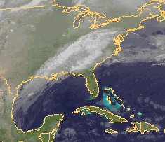 Eine Tiefdruckrinne erstreckt sich mit starker Bewölkung vom Golf von Mexiko nordostwärts bis etwa nach Pennsylvania. In ihrem Bereich kommt es zu teils sehr kräftigen Regenfällen. Allmählich zieht sie jedoch nach Osten ab, sodass sich von Nordwesten her Hochdruckeinfluss mit trockener Luft und weniger Wolken durchsetzen kann.