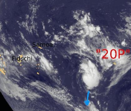 Östlich von Fidschi und Samoa, im Inselgebiet von Französisch Polynesien im Südpazifik, hat sich ein Tropensturm mit den Codenamen '20P' aufgewirbelt. Er ist mit Windgeschwindigkeiten von 65 km/h im Mittel und 95 km/h in Böen aber eher schwach. Da er in südliche Richtung weiterziehen wird, sind von ihm auch kaum bewohnte Inseln betroffen. Ebenso erreicht der Wirbelsturm wahrscheinlich nicht Fischi und Samoa.