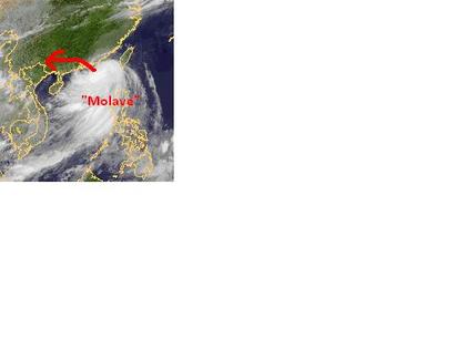 Der tropische Sturm 'Molave' befindet sich auf dem Satellitenbild von Samstag früh mit seinem Zentrum noch im Südchinesischen Meer. Zurzeit erreicht er mittlere Windgeschwindigkeiten von 111, in Böen 139 km/h und erreicht voraussichtlich heute noch die Region um Hongkong. Berechnungen zufolge soll er unter Abschwächung weiter ins Landesinnere von China ziehen.