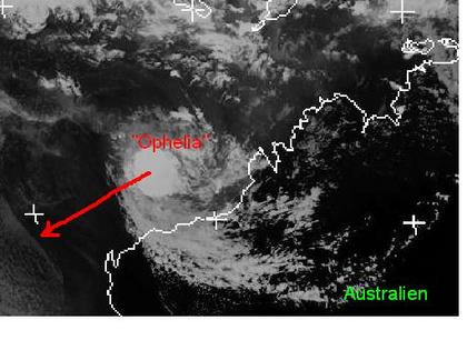 Der tropische Sturm 'Ophelia' über dem Nordaustralischen Becken ist auf dem Satellitenbild von Montag früh gut zu erkennen. Er hat sich im Vergleich zu gestern noch etwas verstärkt, und erreicht nun mittlere Windgeschwindigkeiten von 120, in Böen 148 km/h. Berechnungen zufolge soll er sich nicht weiter verstärken und parallel zur Nordwestküste Richtung Südwesten auf den Indischen Ozean hinaus ziehen. Sein Endziel ist allerdings noch unklar. (Bildquelle: NERC Satellite Receiving Station, Dundee University, Scotland, http://www.sat.dundee.ac.uk/)