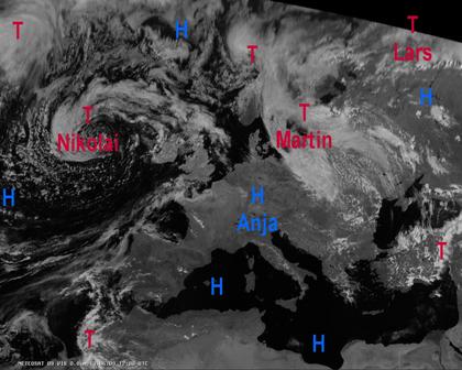 Auf dem heutigen Satellitenfoto zeigt sich über weite Teile Europas vom Mittelmeerraum bis nach Mitteleuropa Hochdruckeinfluss bei nur gebietsweise vereinzelten Wolken. Tiefausläufer bringen sowohl Großbritannien als auch dem Großteils von Skandinavien und dem Westen Russlands vielfach dichte Wolken und einzelne Schauer, teils kann es auch längeranhaltend regnen.