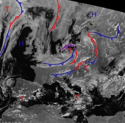 Viele Wolken zeigt das Satellitenbild von Europa heute Mittag. Tiefdruckgebiete liegen dabei über der Ostsee ('Kunibert'), über Südosteuropa, über dem westlichen und zentralen Mittelmeer (hier vor allem mit Schauern und Gewittern) und im Nordwesten auf dem Atlantik. Hoch 'Petra' bei den Britischen Inselnd sorgt wenigstens zwischen Irland und Nordspanien für einige Wolkenlücken.
