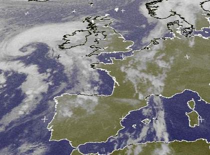 Der ehemalige Hurrikan 'Wilma' liegt heute als gewöhnliches Sturmtief mit seiner Wolkenspirale westlich von Irland und bringt dort kräftige Winde und ergiebigen Regen.