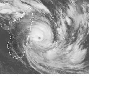 Das Auge des Wirbelsturms 'Gael' östlich von Madagaskar ist auf dem Satellitenbild von Samstag früh gut zu erkennen. Er hat sich im Vergleich zu gestern noch etwas verstärkt, und erreicht zurzeit mittlere Windgeschwindigkeiten von 222, in Böen 269 km/h. Berechnungen zufolge soll er sich jedoch langsam wieder abschwächen und Richtung Süden ziehen. Sein Endziel ist allerdings noch unklar. (c) DWD/Eumetsat