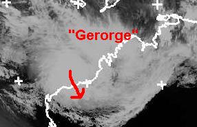 Der Zyklon 'George' liegt derzeit im Nordaustralischen Becken, knapp nordwestlich von Australien. Seine mittleren Windgeschwindigkeiten erreichen zurzeit 158, in Böen 194 km/h. Zurzeit zieht er Richtung Süden und soll Berechnungen zufolge in der Nähe von Port Hedland auf die Küste treffen und unter leichter Abschwächung weiter landeinwärts ziehen. Dabei muss mit ergiebigen Regenmengen gerechnet werden. (Bildquelle: NERC Satellite Receiving Station, Dundee University, Scotland, http://www.sat.dundee.ac.uk/)