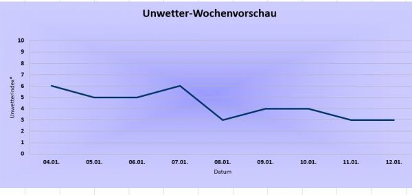 Die wetterbedingten Gefahren werden in der kommenden Woche deutlich größer, denn besonders über der Südhälfte wird mit Schneefällen bis in die Niederungen und Straßenglätte zu rechnen sein. Im Norden und Osten ist es zwar voraussichtlich meist trocken, hier tritt in den Nächten bis Donnerstag jedoch verbreitet mäßiger und stellenweise sogar strenger Frost auf. Zum Wochenende hin steigen die Temperaturen voraussichtlich wieder deutlich an, dabei weht vor allem an den Küsten und im Norden ein starker bis stürmsicher Wind, aber auch in den anderen Landesteilen wird es verbreitet windig.