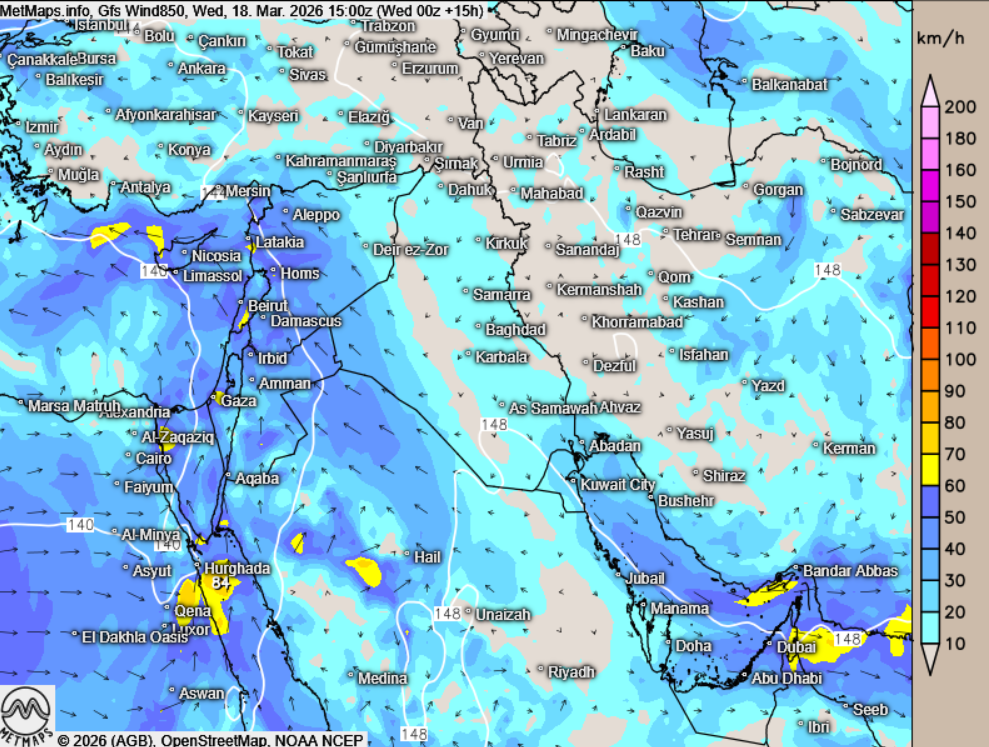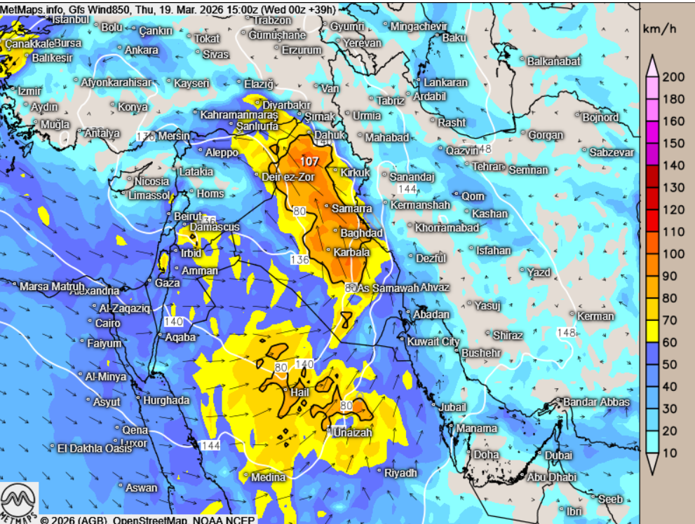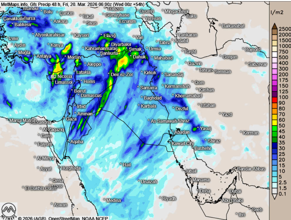 Durch das Sturmtief, das morgen über Syrien und die Türkei zieht, können jedoch Partikel im Nahen Osten verstärkt abregnen – insbesondere über dem Irak und Iran, teilweise auch über der Türkei und Syrien. Die Wetterlage ist von Sturmböen und starkem Regen geprägt.