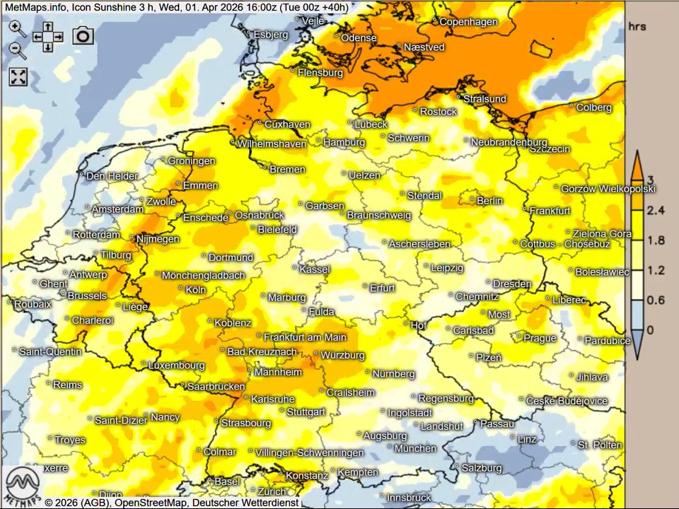 Die Drei-Stunden-Sonnenscheindauer am Mittwoch (bis 16:00 Uhr) nach ICON - die Sonnenscheindauer bis Ostern findet Ihr im Sonnenfilm auf unserer Facebook-Seite!