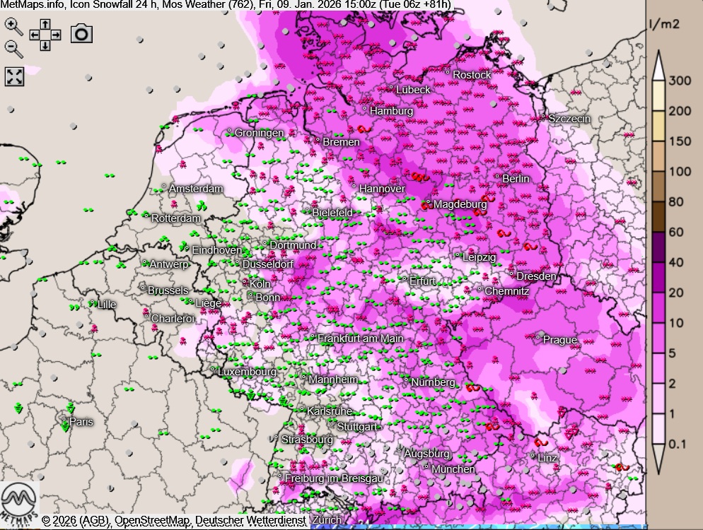 Zu erwarten ist dabei eine Kombination aus starkem Schneefall und Glätte, (schweren) Sturmböen und lokal teils erheblichen Verwehungen, die vor allem im Norden und Osten Deutschlands und in den Mittelgebirgen zu massiven Einschränkungen im Straßen-, Schienen- und Luftverkehr führen werden.