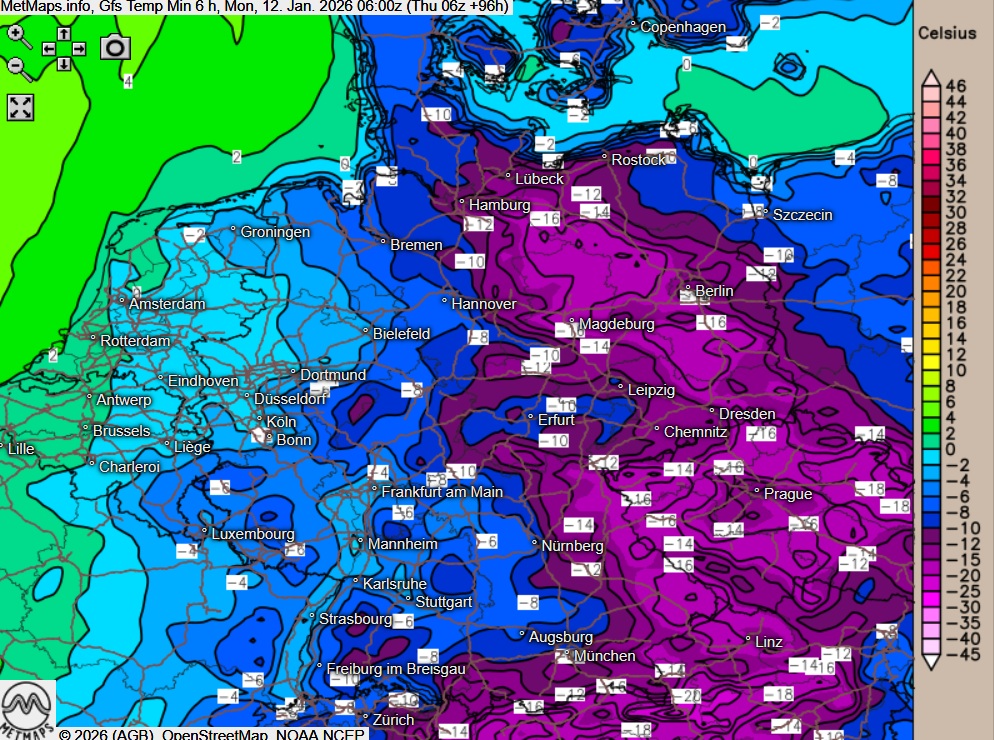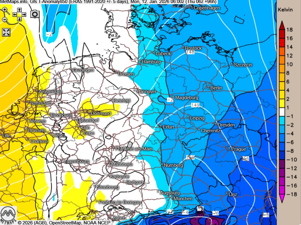 Die Abweichung vom Temperaturmittel (1991-2020) sowie die Sechs-Stunden-Tiefstwerte für Montagmorgen (06:00 Uhr) nach GFS:
