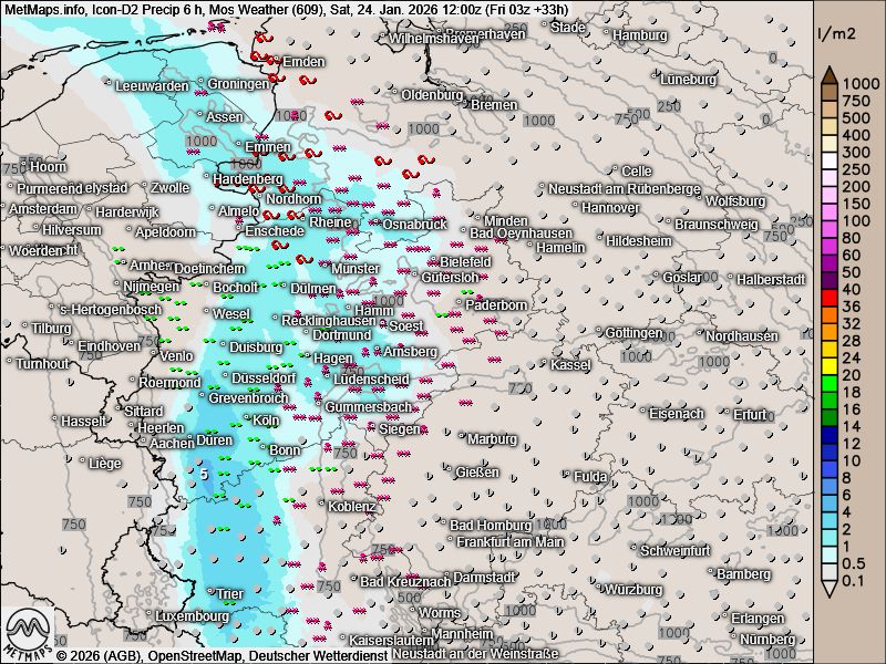 Die Sechs-Stunden-Regenmengen mit Eisregen (rote Kringel) bis Samstagmittag nach ICON: