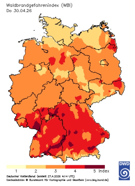 Besonders kritisch schätzen wir die Phase vom 29. April bis zum 1. Mai ein: Laut aktueller Prognosen werden in diesem Zeitraum in vielen Regionen, insbesondere im Süden/Südwesten und im Osten Deutschlands, die höchsten Warnstufen erreicht.