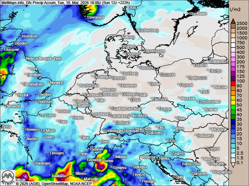 Die akkumulierten Niederschlagsmengen bis zum 10.03./ 11.03. nach GFS / ECMWF: