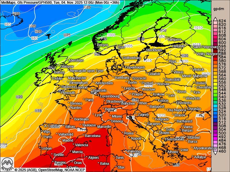 Die 500-hPa-Höhenkarte sowie die Temperatur- und Wetterkarte für Dienstagmittag nach GFS: