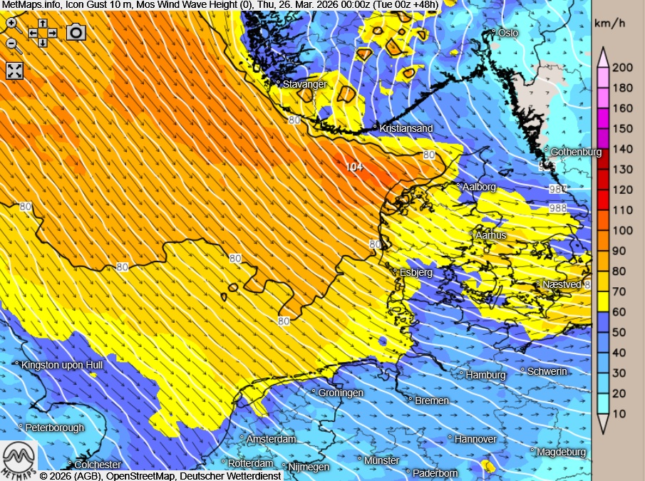 In Richtung Küsten nimmt die Wellenhöhe zwar ab, bleibt aber weiterhin auf hohem Niveau. Besonders betroffen sind die Küstenabschnitte von Dänemark sowie der südlichen Küsten Norwegens, wo auflandiger Wind für zusätzliche Belastungen sorgt.