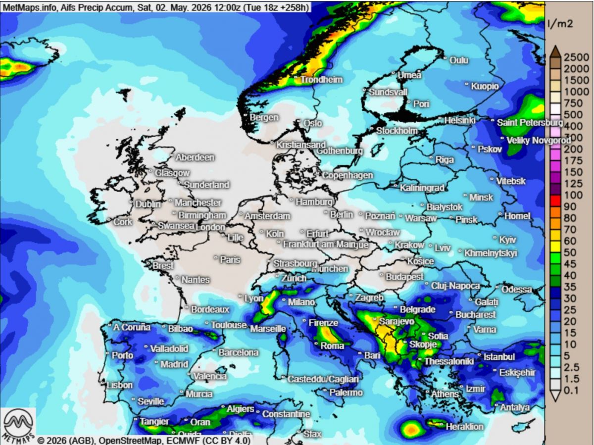 Besonders auffällig ist das sogenannte "Regenloch", das sich auf den aktuellen Prognosekarten abzeichnet. Es erstreckt sich als breiter Korridor von den Britischen Inseln über die Benelux-Staaten und Deutschland bis weit nach Polen hinein. In diesem Bereich zeigen die Modelle bis zum 2. Mai 2026 praktisch keine nennenswerten Niederschlagssignale.