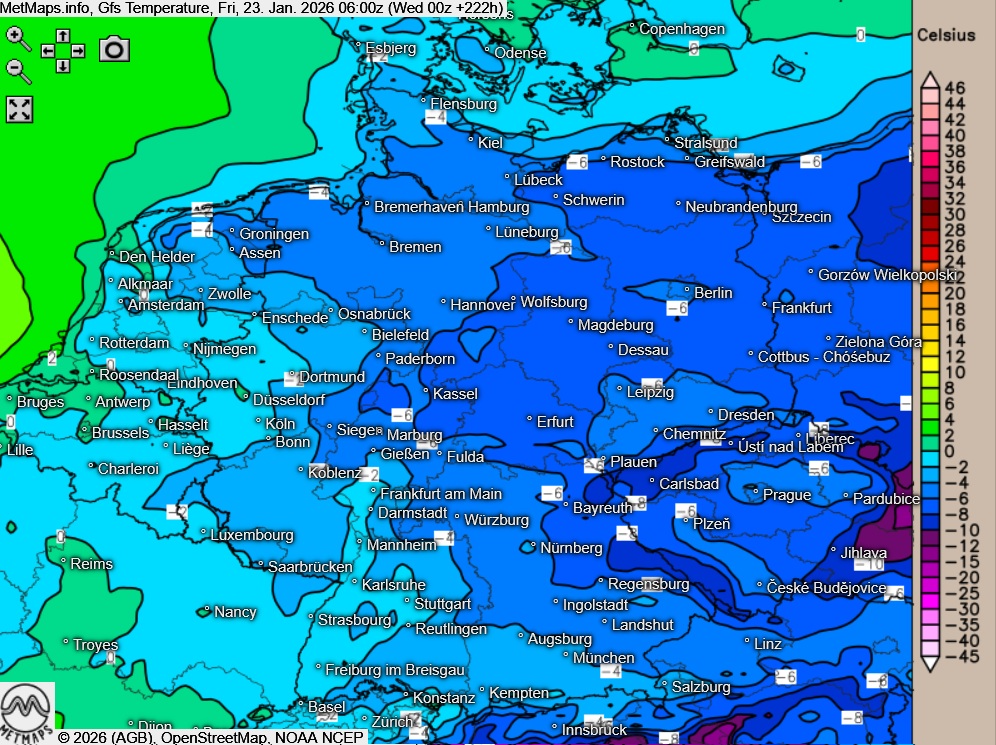 Lufttemperaturen 23.01.2026 (06:00 Uhr) nach GFS