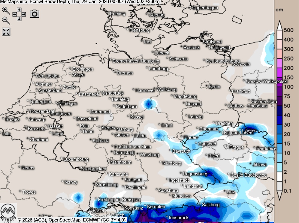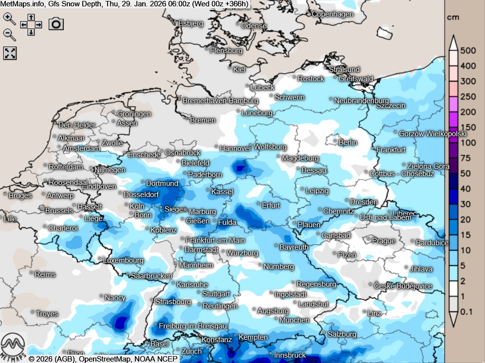 Während das europäische Wettermodell nennenswerte Schneemengen im Wesentlichen auf die Mittelgebirge und die Alpen beschränkt, prognostiziert das US-Modell GFS bis zum Monatsende eine verbreitete, teils flächendeckende Schneelage (siehe Vergleichskarten für den 29.01.2026).