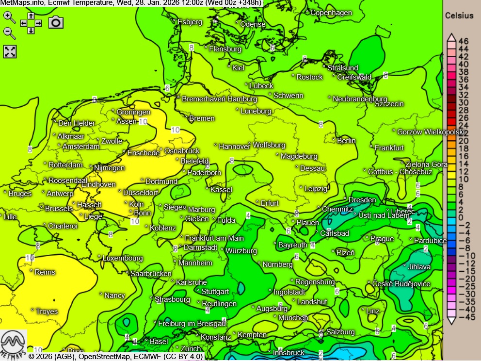 Lufttemperaturen 28.01.2026 (12:00 Uhr) nach ECMWF