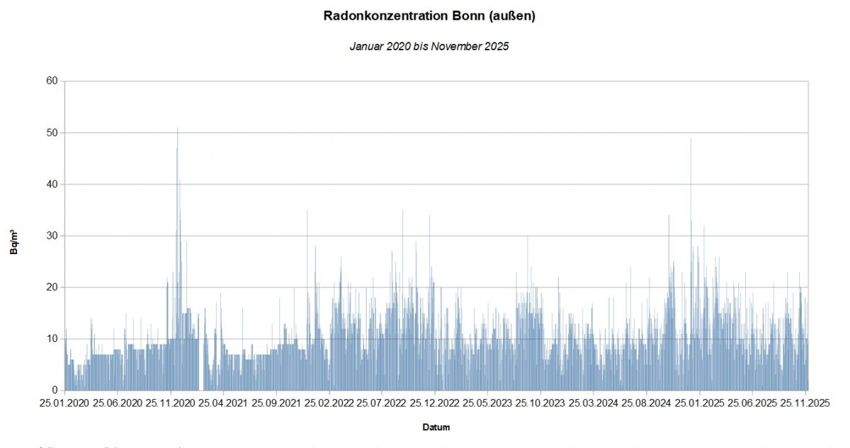 Auch donnerwetter.de misst täglich die Radonkonzentrationen an mehreren Messstandorten. Eine Auswertung für den Standort Bonn (Außenwerte) für den Zeitraum Januar 2020 bis November 2025 decken sich in etwa mit den Werten des Bundesamtes für Strahlenschutz.