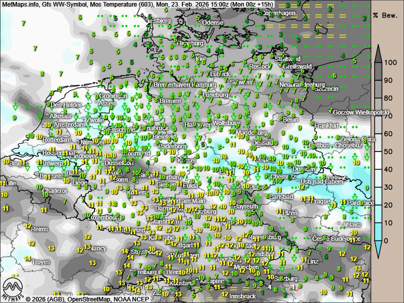 Die Temperaturanomalie am Mittwochnachmittag (15:00 Uhr) sowie die Wetter- / Temperaturkarten für Montag-, Dienstag- und Mittwochnachmittag (15:00 Uhr) nach GFS: