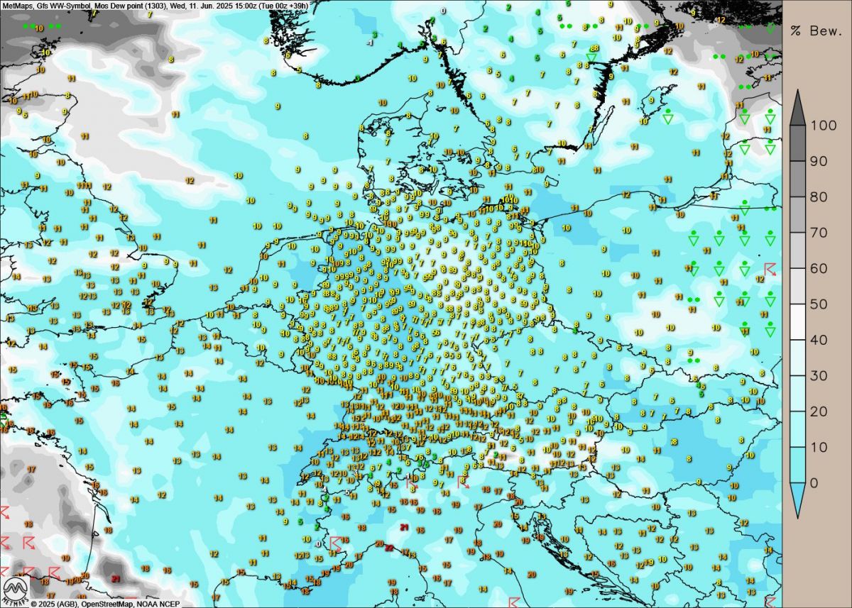 Nachfolgend die Entwicklung des Wetters sowie der Taupunkttemperaturen von Mittwoch bis Samstag - die Taupunkttemperaturen legen in diesem Zeitraum einen Anstieg von 10 Grad hin - klebrig-schwitziges Waschküchenwetter ist also vorprogrammiert.
