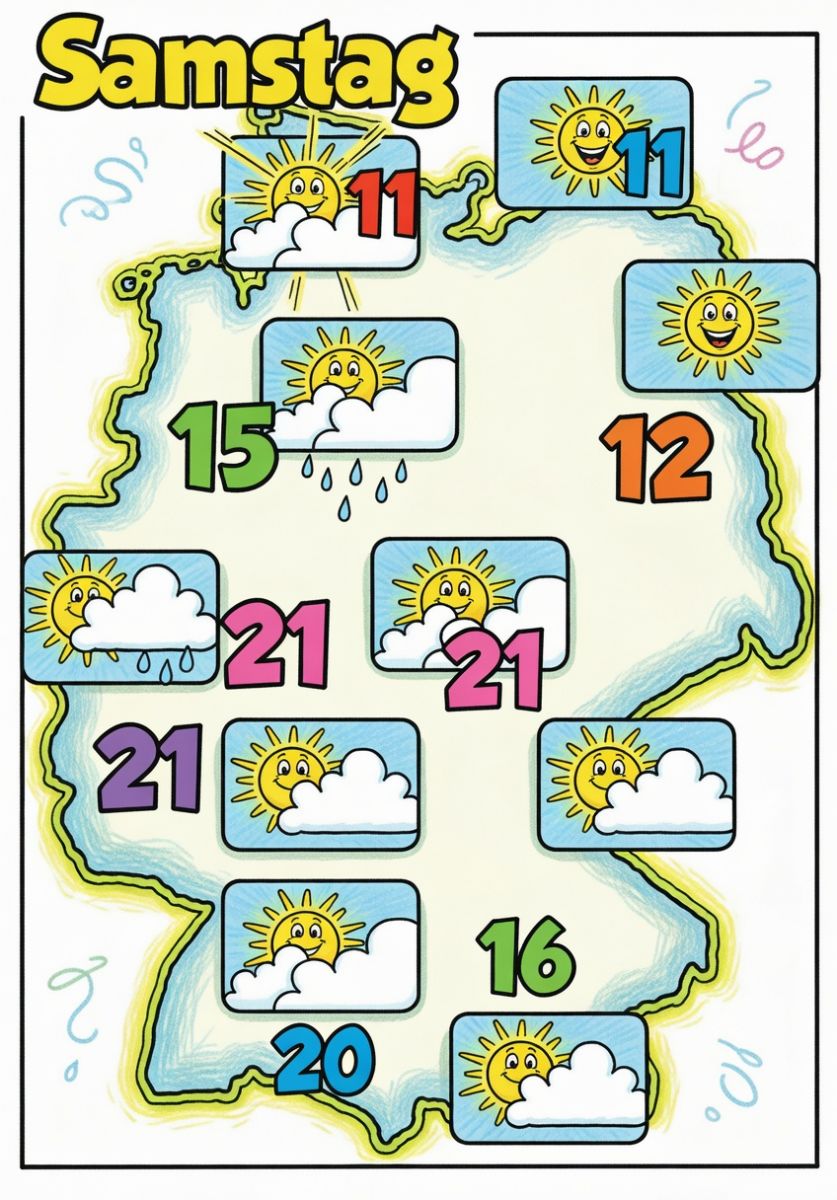 Im Norden und Nordosten (z. B. bei 11 °C und 12 °C) dominieren freundliche Sonnen mit vereinzelten Wolken. Es ist der kühlste Bereich auf der Karte.