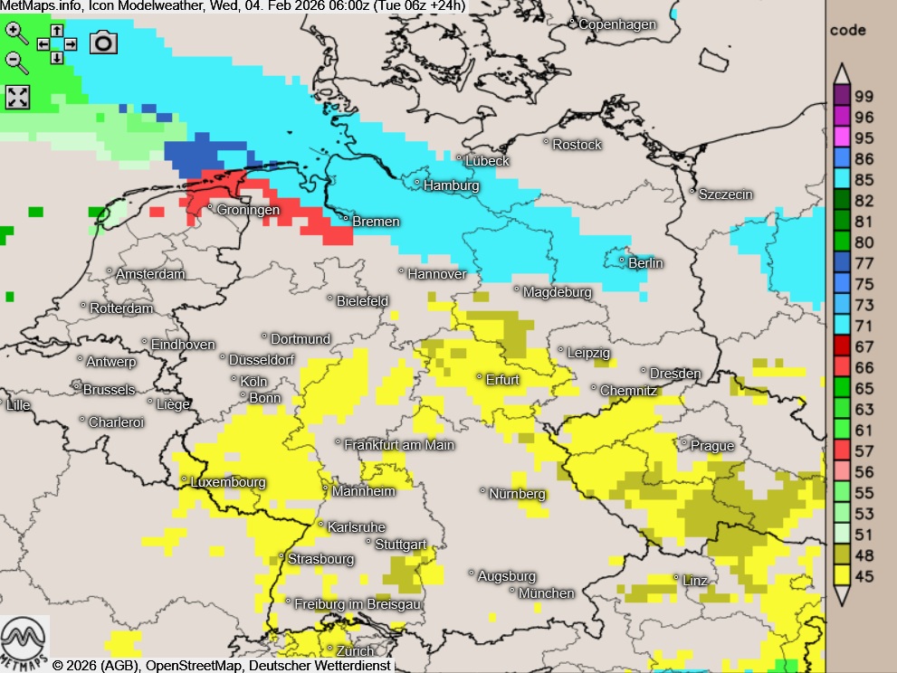 Die Prognosekarten für Dienstagabend (18:00 Uhr) sowie für Mittwoch 00:00 Uhr und 06:00 Uhr