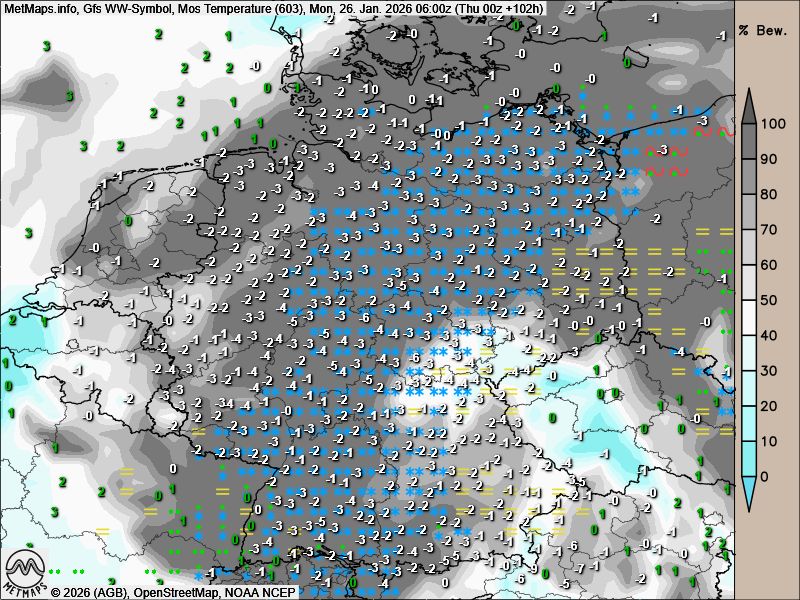 Während die Wetterentwicklung für die kommende Woche noch mit großen Unsicherheiten behaftet ist, zeigt das US-Wettermodell GFS für Sonntag bis Montag eine ausgeprägte Schneelage.