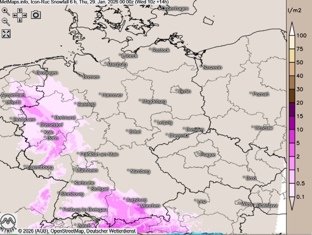 Einen besonders großen Schneezuwachs gibt es dabei im Bereich vom Schwarzwald über die Schwäbische Alb bis ins Allgäu: Hier sind verbreitet Neuschneemengen bis 15 cm möglich, in Staulagen auch mehr.